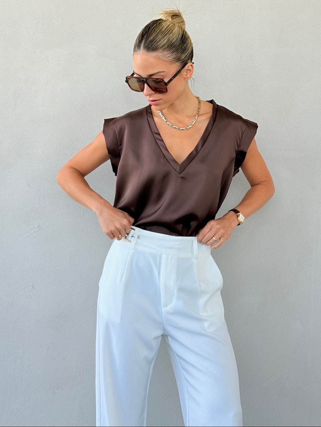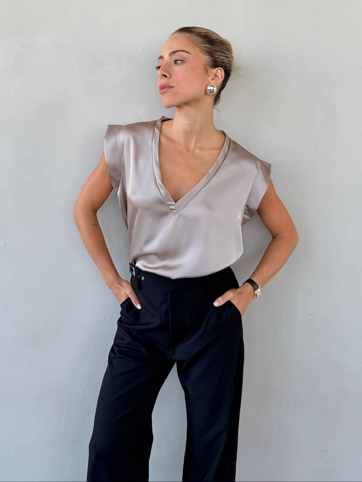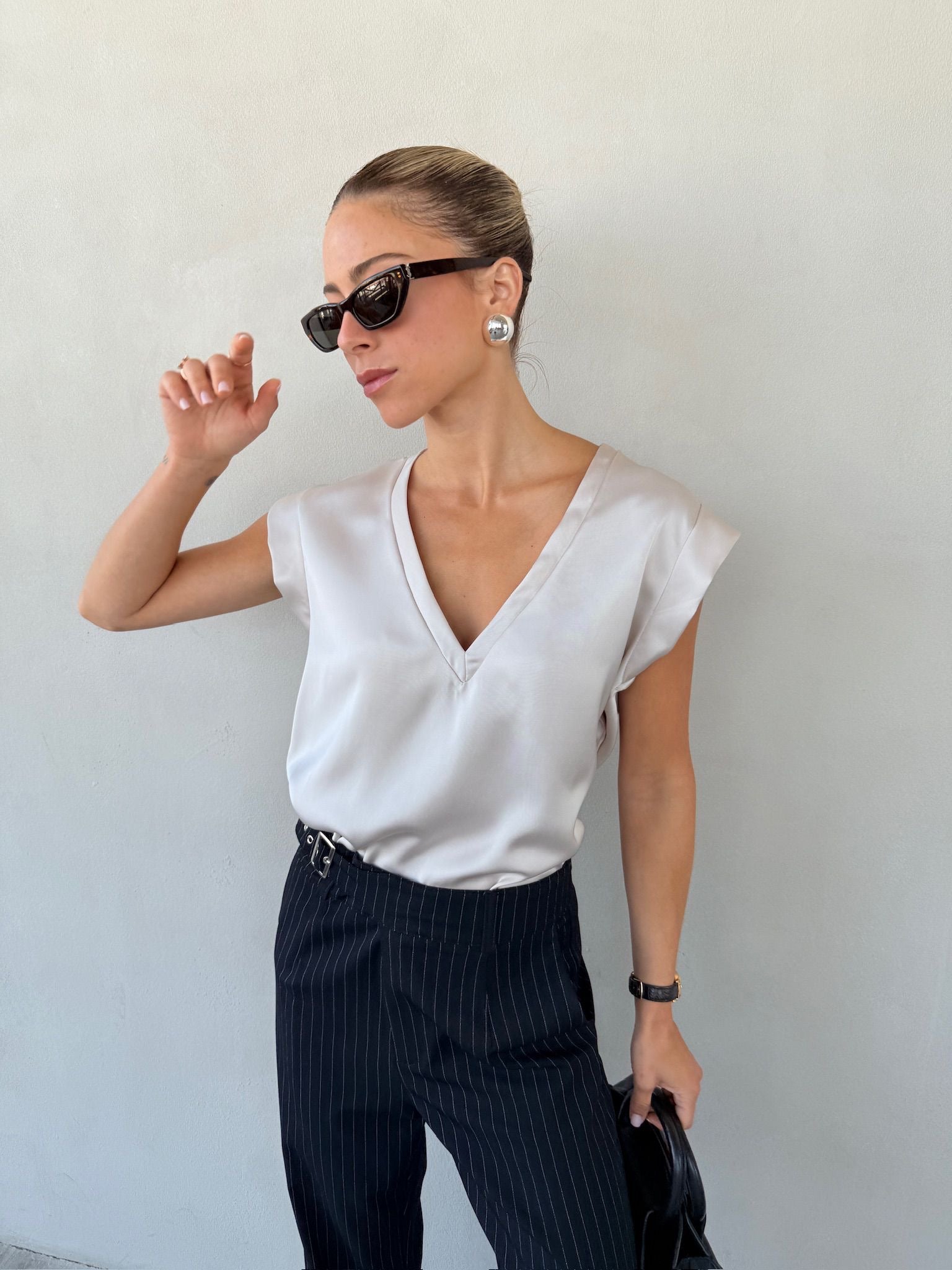 חולצת מבד סאטן משי במפתח וי ללוק קלאסי ונשי במיוחד.