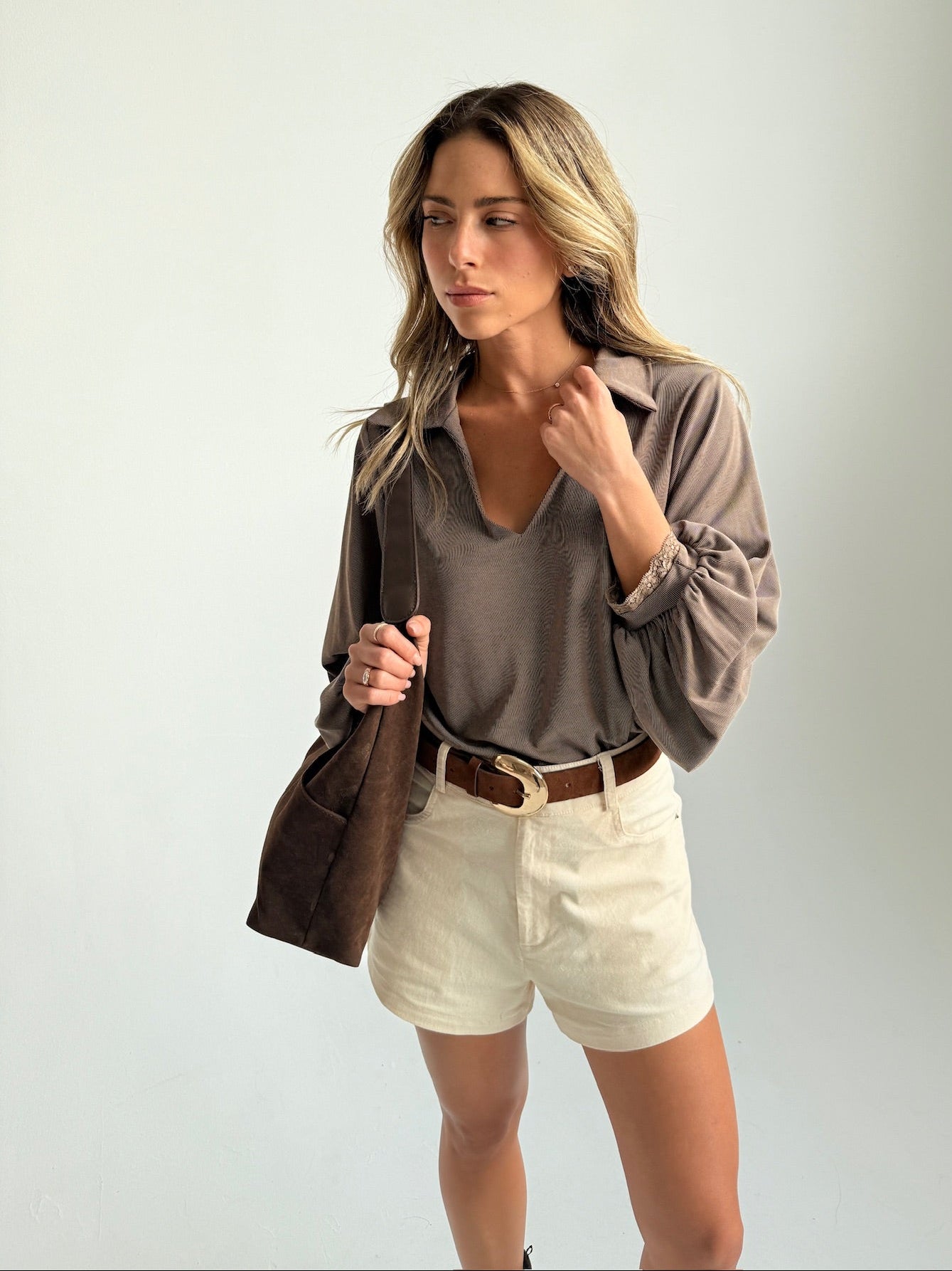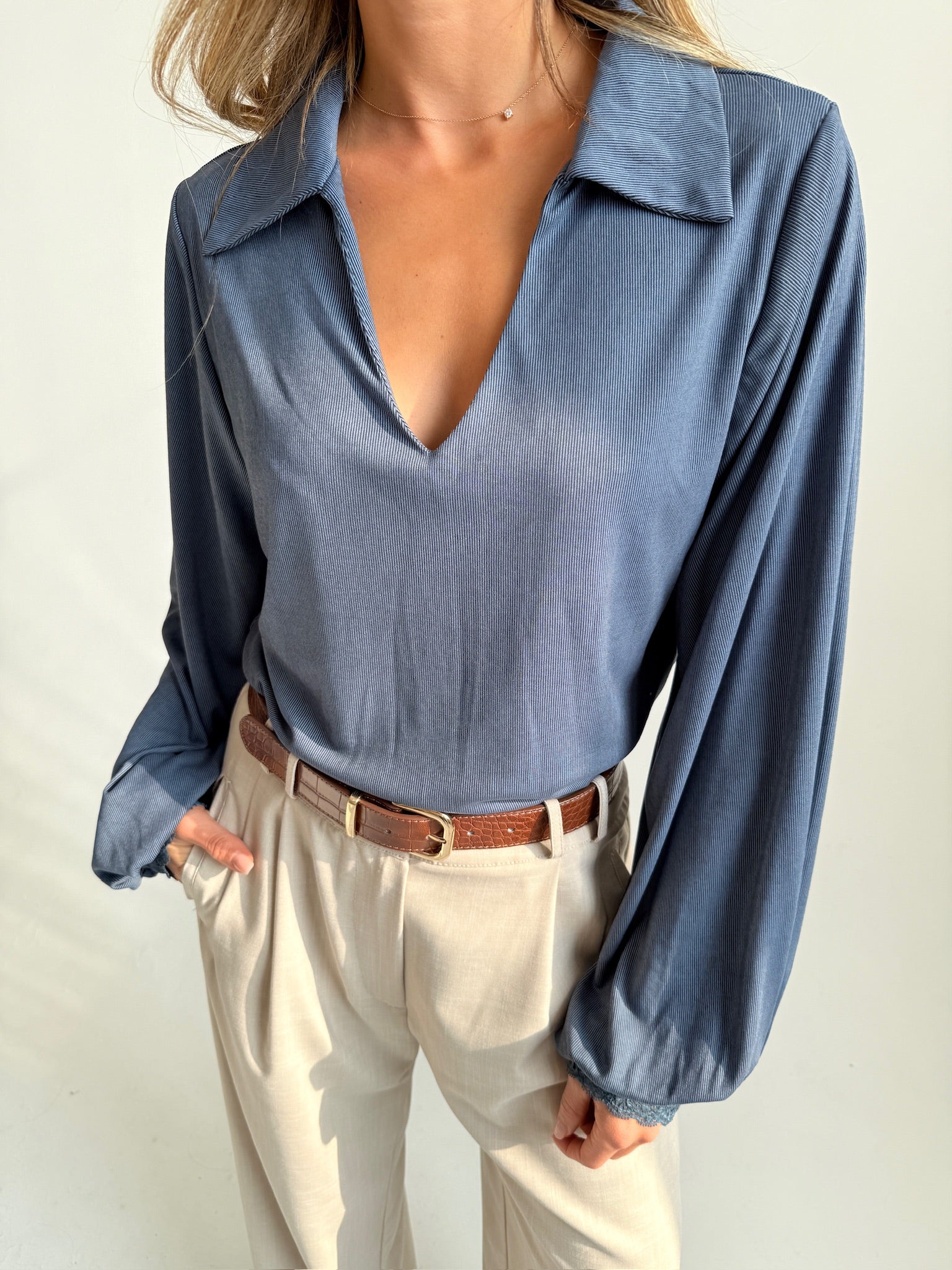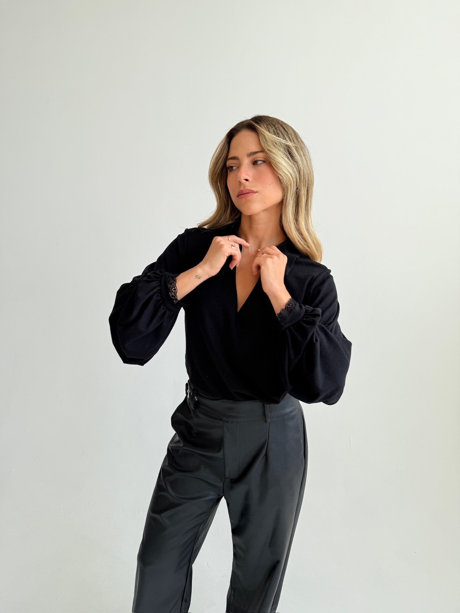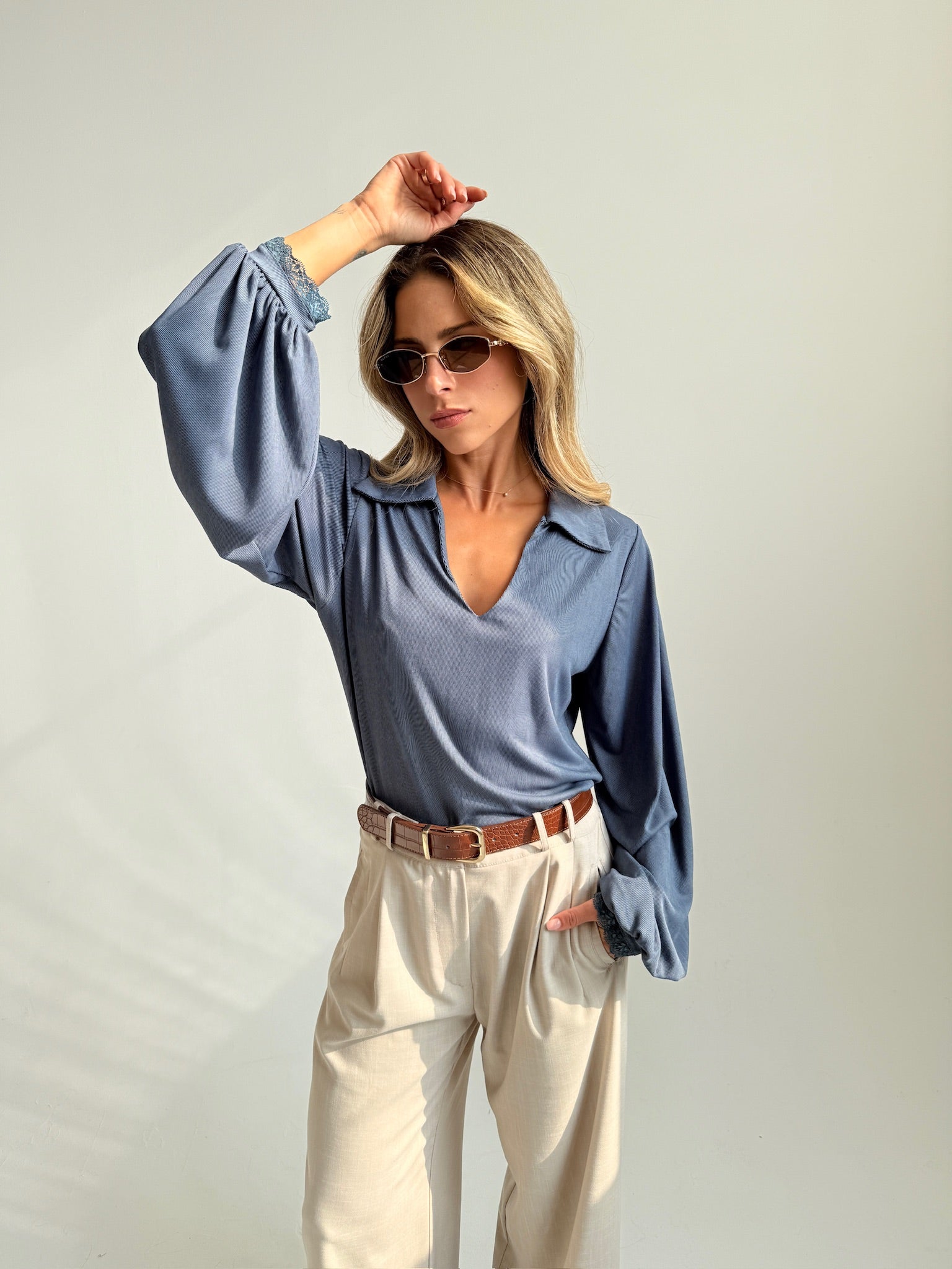 חולצה מבד מודל, איכותי ונעים על הגוף בשילוב שרוול בלון וסיומת תחרה.
