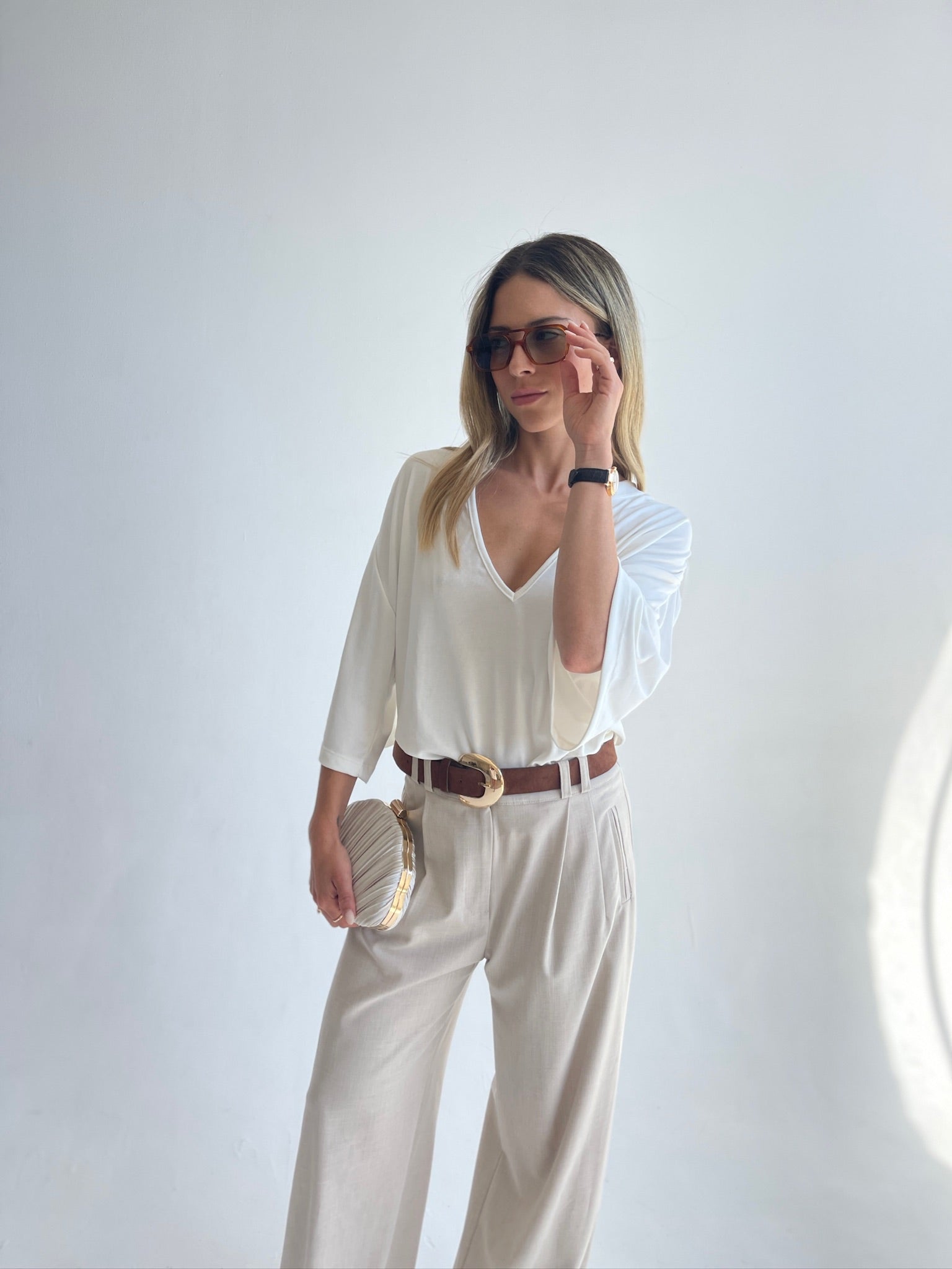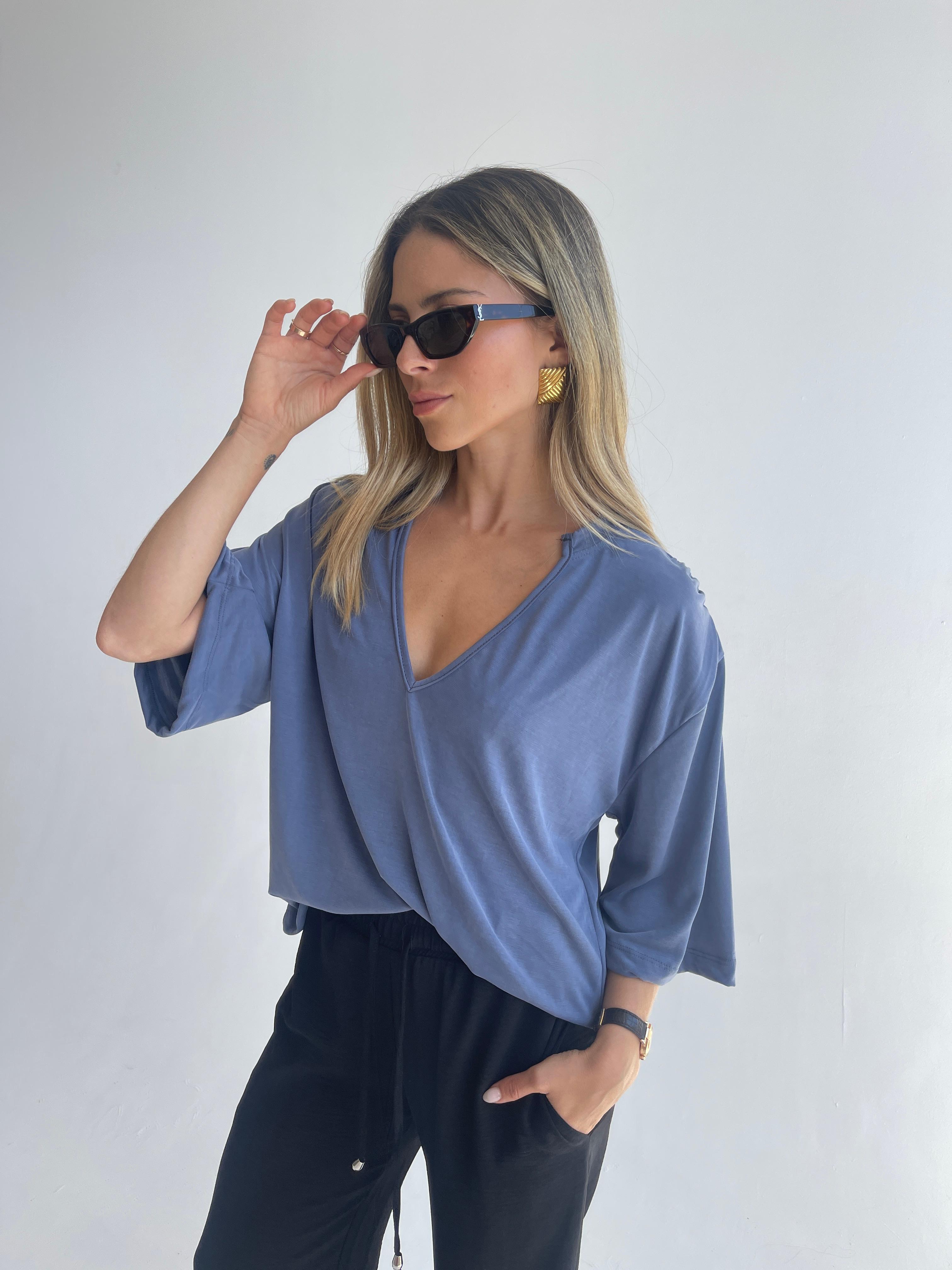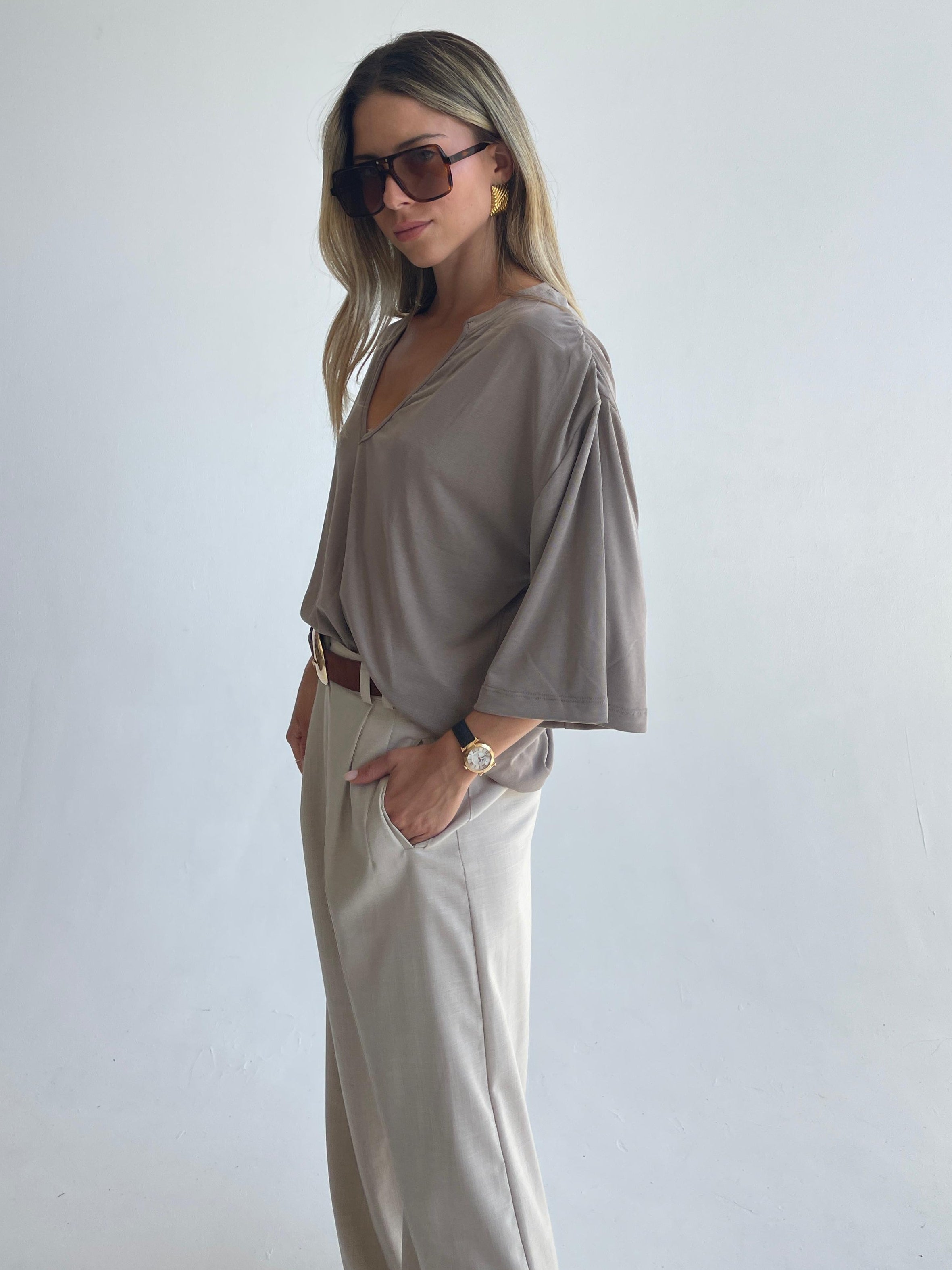 חולצה נשית עם כיווץ עדין בכתפיים שמוסיף טאץ’ מחמיא ושיק עדכני. גזרה נוחה וקלילה שמתאימה ליום יום.